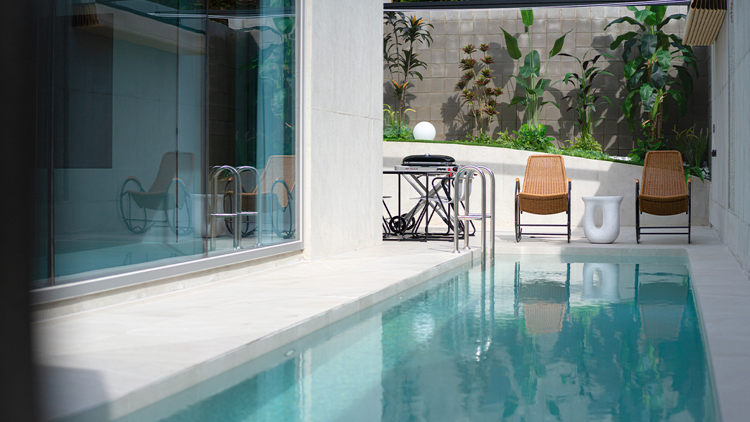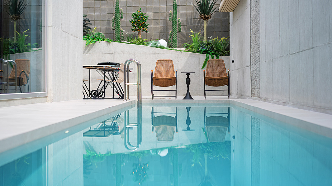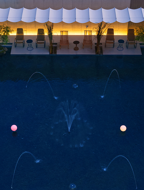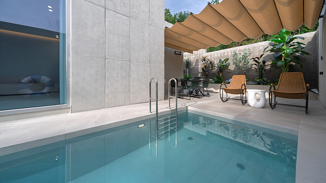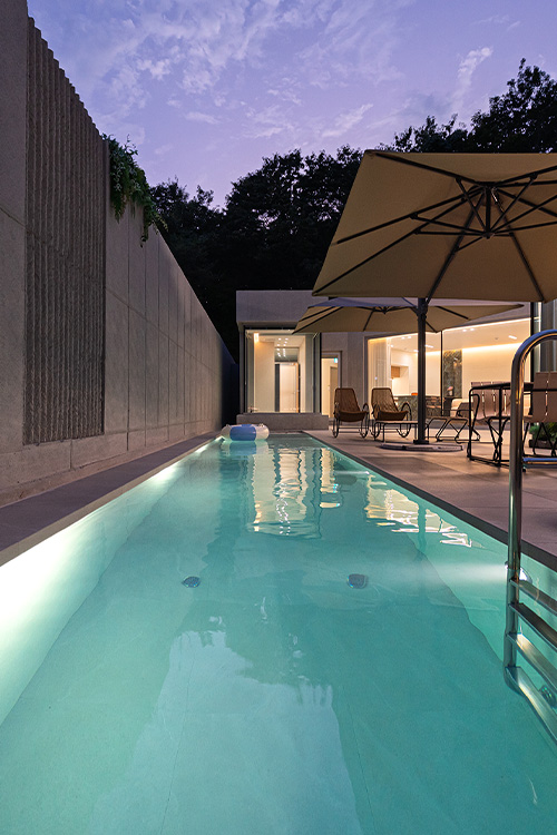 은은한 조명 아래 빛나는 수영장은 낮에는 청량한 즐거움,